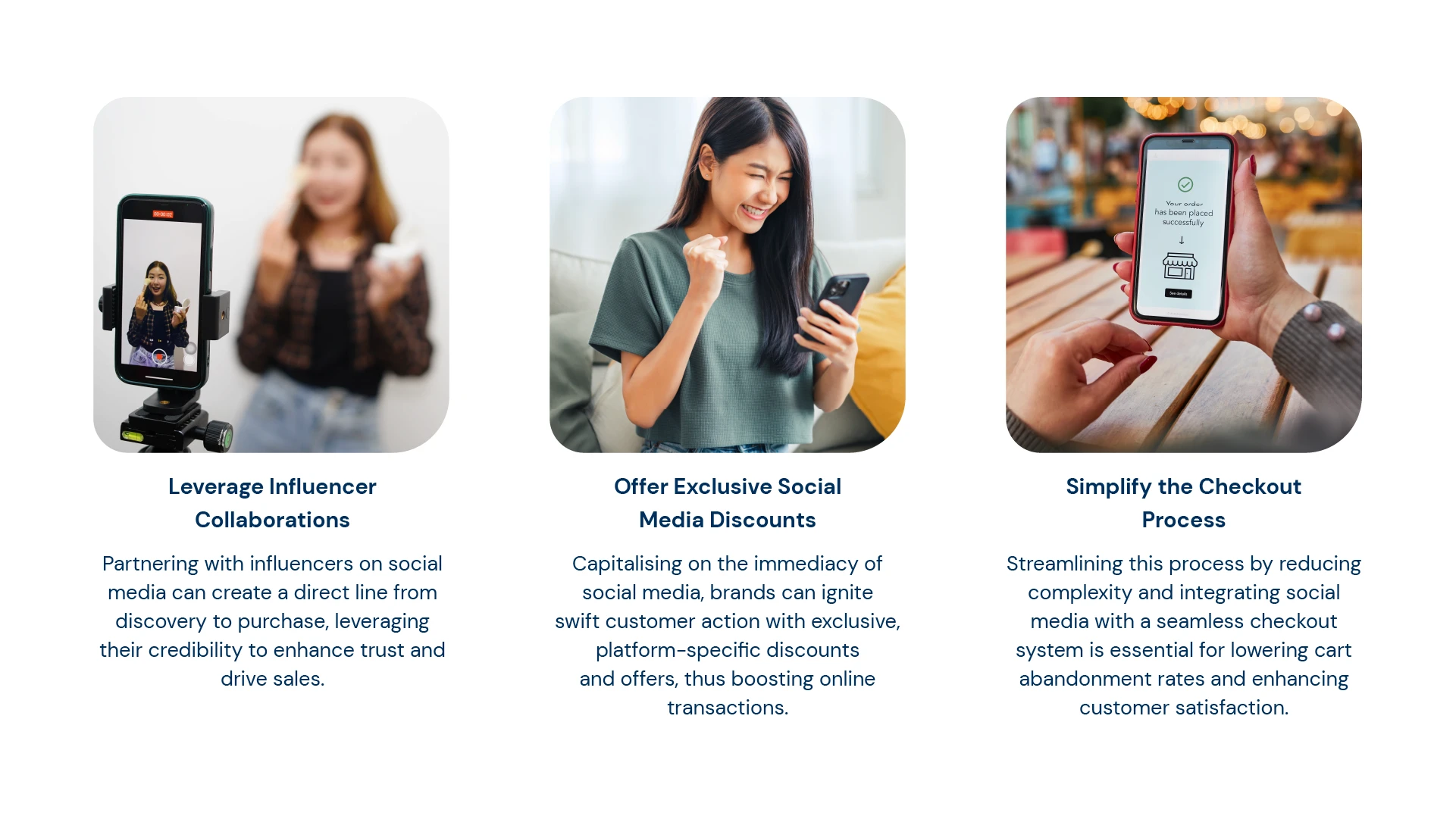 Coupled with a substantial 75% cart abandonment rate,⁴ there is a clear demand for a more efficient checkout process. Hence, establishing a direct connection between social media platforms and an easy-to-navigate checkout page is crucial to alleviate the obstacles affecting sales completion.