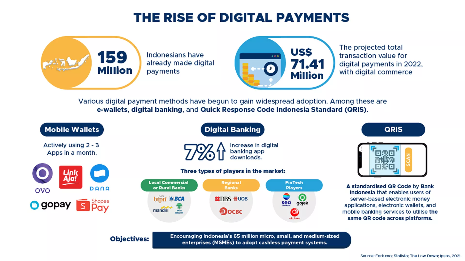 A major contributing factor in the acceleration of digital payments in Indonesia is the introduction of the comprehensive digital payments system, known as Quick Response Code Indonesia Standard (QRIS) by Bank Indonesia earlier in 2019. The system was developed with the objective of encouraging Indonesia's 65 million micro, small, and medium-sized enterprises (MSMEs) to adopt cashless payment systems.⁸