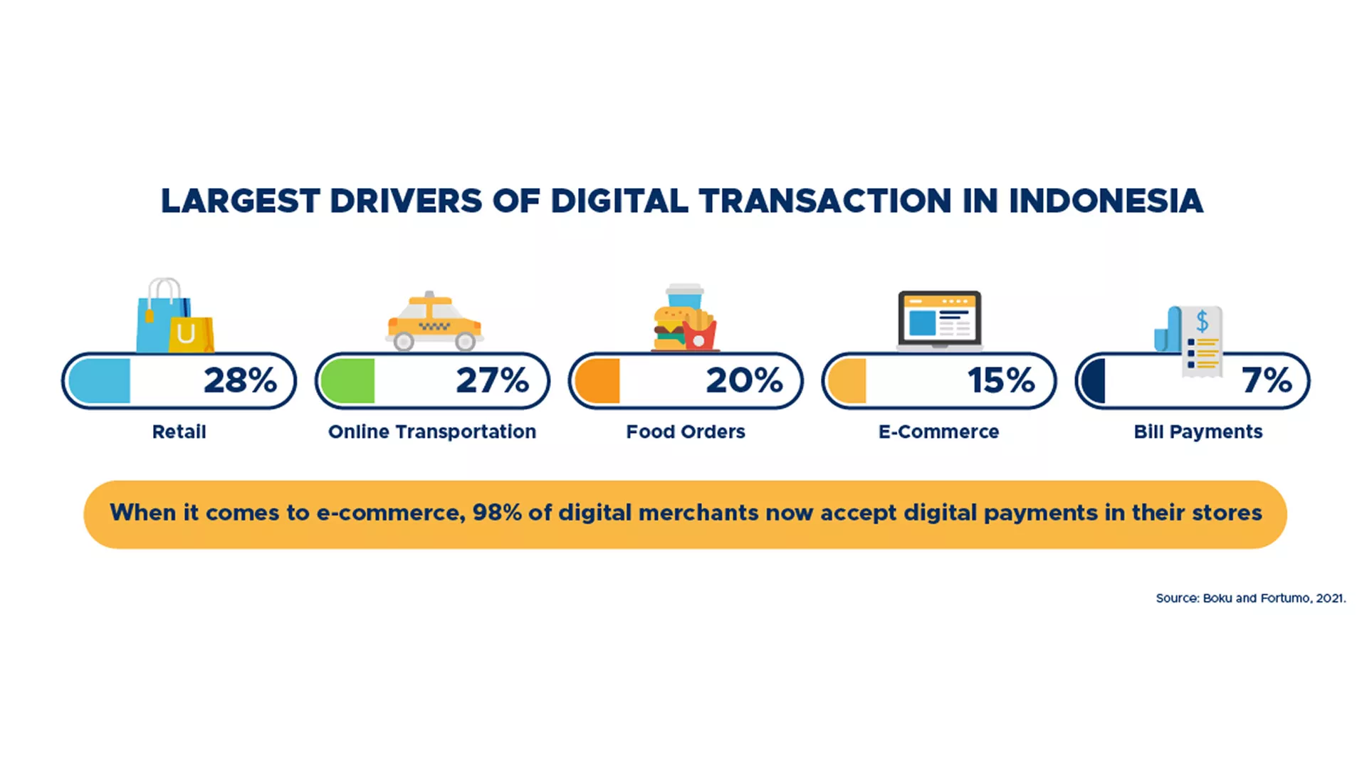 In Indonesia, digital payments are supported in both online and offline transactions. In 2020, the largest transactions came from retail (28%), online transportation (27%), food orders (20%), e-commerce (15%), and bill payments (7%).12 A 2021 survey showed that 81% of respondents used digital payments to pay for online shopping and simultaneously utilised this form of payment for chain stores (46%), local stores (36%), and public transportation tickets (38%).¹³