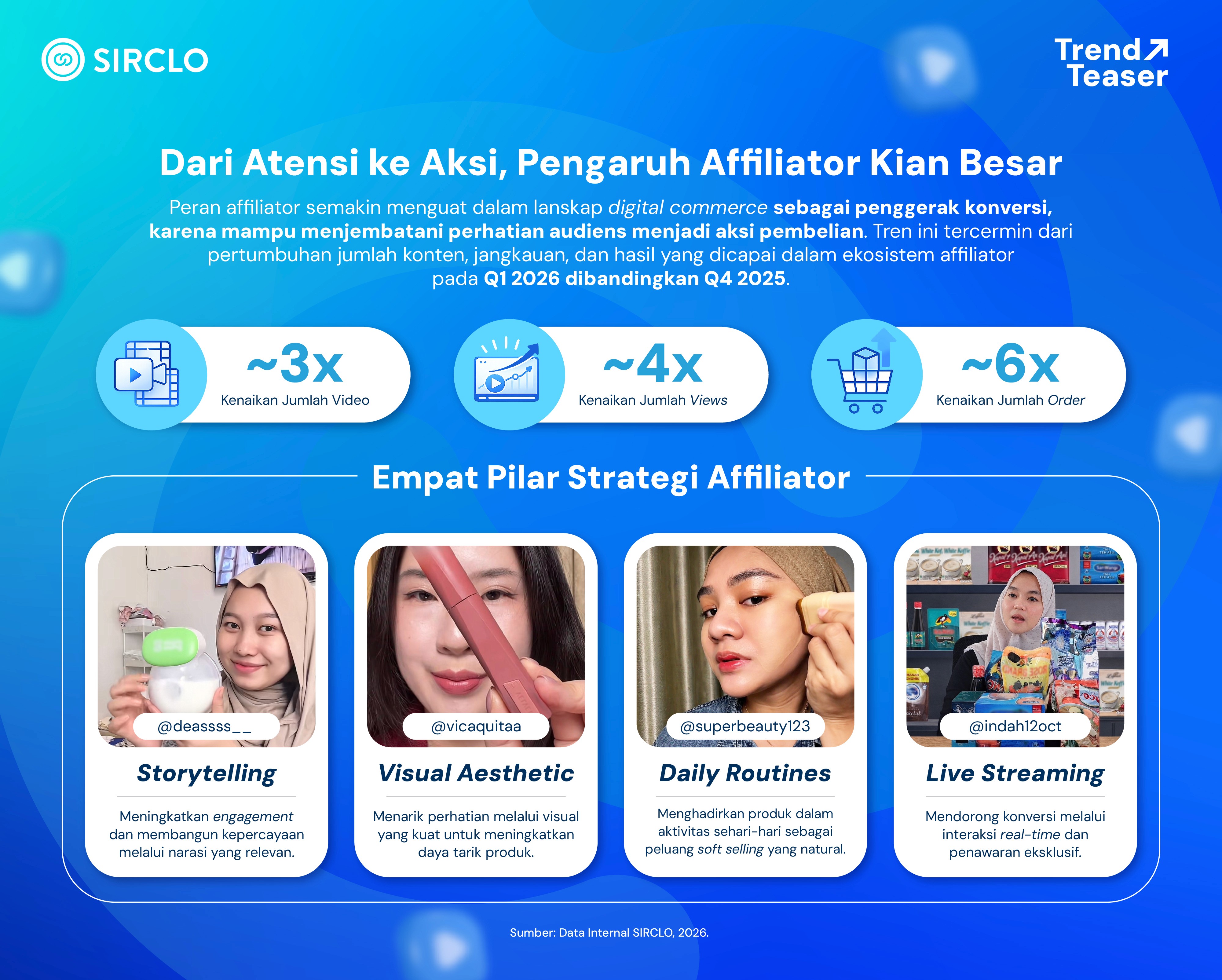 Berdasarkan data internal SIRCLO, ekosistem affiliator menunjukkan pertumbuhan yang signifikan dari kuartal IV 2025 dan kuartal I 2026. Peningkatan ini dipengaruhi oleh bertambahnya jumlah content creator serta meningkatnya aktivitas campaign, terutama pada momen belanja musiman seperti Ramadan yang diperkuat oleh berbagai promosi.